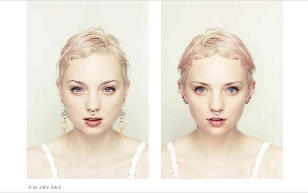 一位摄影师对脸的对称性很感兴趣,于是发起了一个项目,号召各位摄影师利用PS软件,将之前拍摄的模特肖像照分别做左脸对称和右脸对称的处理,按照这样的方式得到一组精妙对称的完美脸。这些完美脸被保存在专门的图库中。
