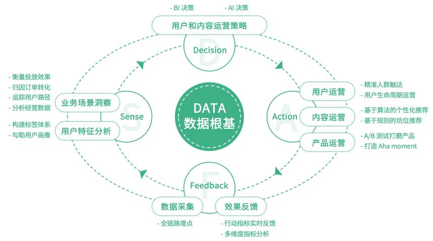 我认为任何一家企业最终都归为基于数据流的企业运营框架 SDAF ,包含四个环节——感知(Sense)、决策(Decision)、行动(Action)和反馈(Feedback),它们形成一个闭环,而数据可以让这四个环节具象化,并且量化地衔接到一起。