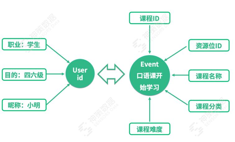 假设用户小明,为了提高六级成绩在流利说 App 点击四六级听力必备句型课程开始学习,基于用户行为模型,即 User-Event 模型,其在流利说 App 内的用户行为关键路径如下: