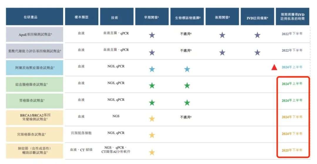 这3款产品,检测中使用的均是第三方研发的试剂盒,美因基因提供的仅仅是检测服务。目前无论是消费级基因检测还是疾病筛查,美因基因都没有产品获得IVD(体外诊断)证。招股书显示,美因基因有三款癌症筛查试剂盒在研,但预期获证时间均在2024年。