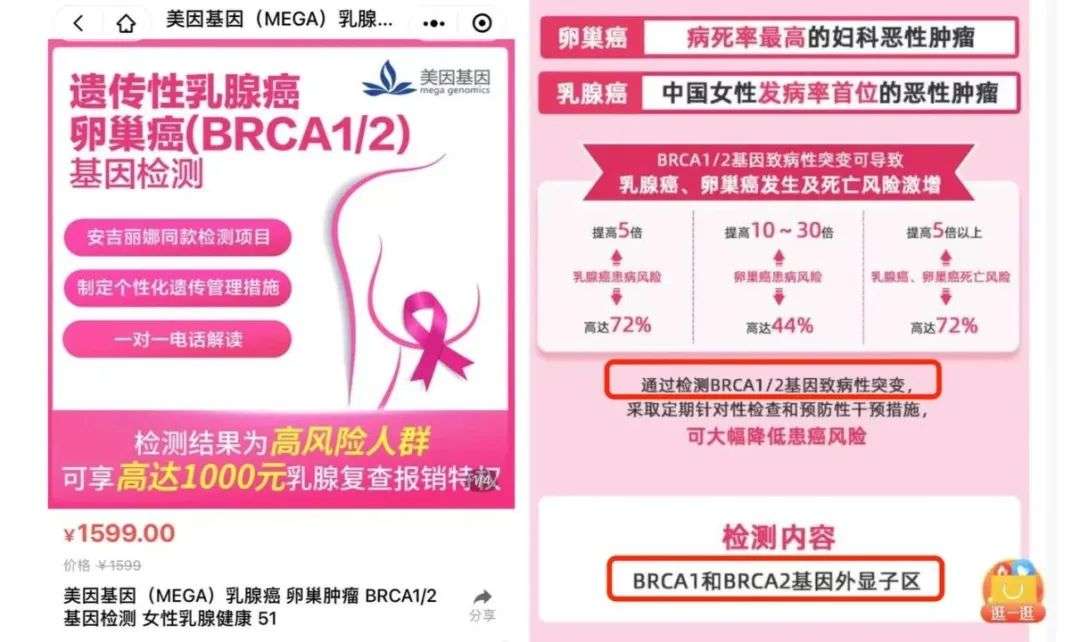 比如,在美因基因微店上售卖的一款遗传性乳腺癌、卵巢癌基因检测(美因大健康管理N套餐),属于患癌风险检测。据商品描述,该产品仅检测BRCA1/2致病性突变,售价却高达1599元。