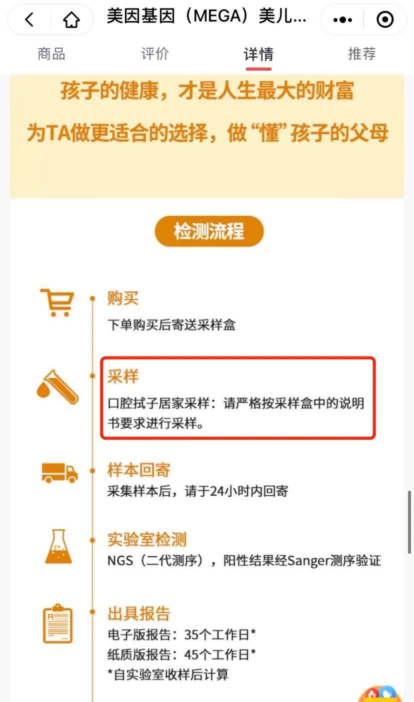 但令人起疑的是,据该商品详情介绍,全外显子组基因检测仅需要“口腔拭子居家采样”,这与行业内的常规采样手段有所出入。一位做过全基因组测序的业内人士告诉节点财经,当时自己做的时候抽了好几管血,而口腔拭子上的DNA含量极少,可能无法进行测序。