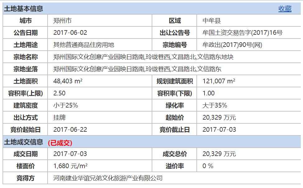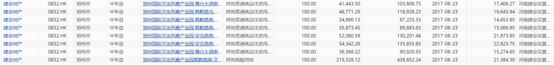 Wind显示,2015年10月15日,建业以1.38亿元竞得郑州市中牟县两宗地,性质为其他商服用地。地块总占地面积约8.01万平方米,预计建筑面积约12.02万平方米,折合楼面价约1150元/平方米。