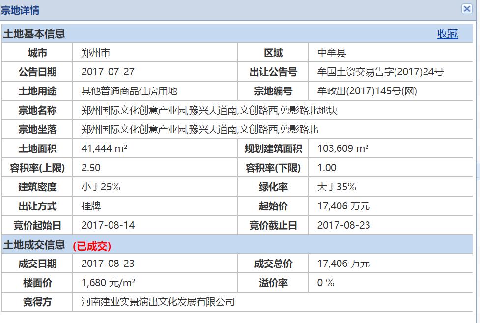 戏剧幻城的情况也是类似。戏剧幻城的操盘方是河南建业实景演出文化发展有限公司,该公司2017年8月23日在中牟县拍下9宗地块,其中2宗为其他商服用地,是戏剧幻城和配套酒店的用地,其余7宗也都是住宅用地,同样的楼面价皆为1680元/平方米,同样的溢价率为0,7宗住宅用地的建筑面积也达到了75万平方米。