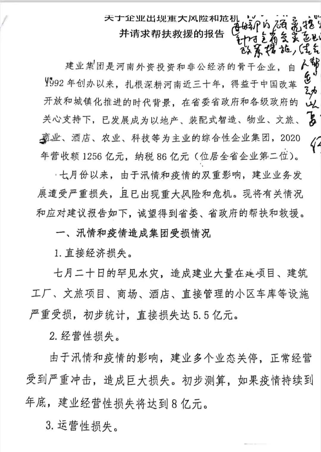 “建业确实向政府提交了相关报告,内容真实。”对于这份《关于企业出现重大风险和危机并请求帮扶救援的报告》,建业方面如此回复。