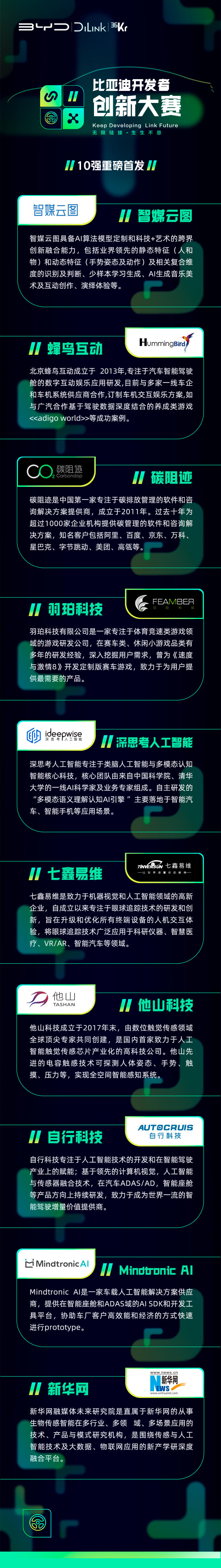 10 强团队中有从事智能座舱研究的智媒云图 、深思考人工智能、他山科技、自行科技、Mindtronic AI、新华网融媒体未来研究院;也有从事智能安全/智能驾驶研发的七鑫易维;还有车载游戏厂商蜂鸟互动、羽珀科技;另有绿色出行应用开发商碳阻迹。