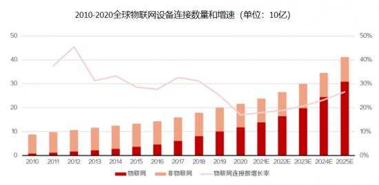 根据IoT Analytics的统计,2020年全球物联网设备连接数首次超过非物联网设备连接数达到126亿个,预计2025年将达到215亿个。此外,根据中国通信院的统计,截至2020年,中国物联网产业链规模突破1.7万亿元,十三五期间物联网总体产业规模保持20%的年均增长率。《螳螂观察》认为,受上游物联网模组成本降低,下游应用更加丰富,巨头投入增加等因素影响,使物联网产业链日趋成熟,常年保持高速增长。