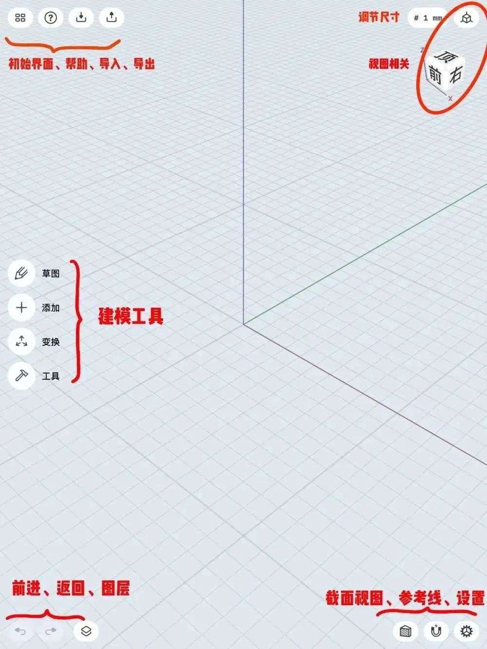 言归正传,我打开 Shapr3D 立马新建项目,软件会自动生成 XYZ 坐标轴,方便用户在制作模型的过程中时刻确定方位,避免在错误的平面创建细节件。