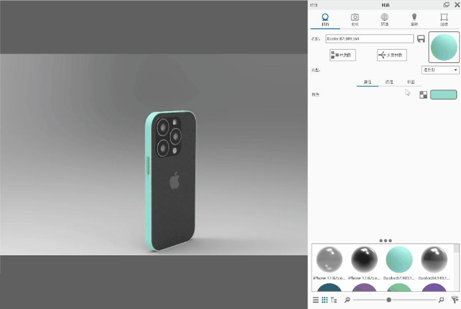 据悉,这代 iPhone 13 Pro 中框依旧采用不锈钢材质,在光照下会呈现出绚烂的金属光泽,那么在渲染过程中我们就要给中框贴上金属材质,粗糙度为 0,并将配色调整成合适的灰黑色。