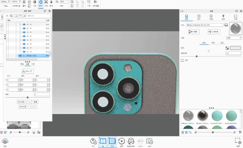 我把之前建好的模型拖至 KeyShot,为不同部件贴上不同的材质,这部分的难点在于调节材质的不同参数,譬如粗糙度、折射指数、颜色等等。对每一项参数进行微调,都会影响到成品质感,于是我们需要不断重复尝试,以达到最接近大众认知中 iPhone 的质感。