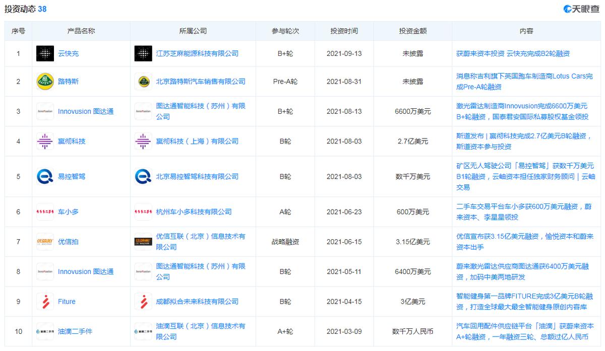 蔚来资本管理的首期人民币基金由蔚来汽车、红杉中国、高瓴资本和长江产业基金联合发起设立, 目标规模100亿元人民币,另外还有美元基金部分受到来自保时捷创投的支持。有雄厚的资金储备作为基础,从天眼查的披露可以看到,截至目前蔚来资本共有38项投资动态,光今年以来就有十余起投资事件。