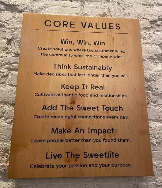Sweetgreen的价值观——“赢、赢、赢”、“可持续思考”、“保持真实”、“添加甜蜜触感”和“产生影响”--都会影响他们的商业决策、雇佣的人以及如何庆祝他们的成功。