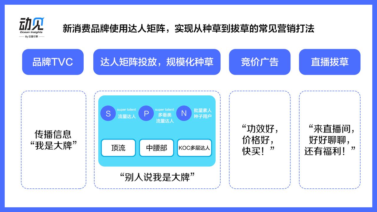 对于新消费品牌来说,规模化达人合作更是常见操作。巨量星图业务负责人丁晓方介绍说,以美妆客户为例,往往会先通过TVC讲述品牌故事,在达人矩阵上,先合作1-3个明星达人进行背书证言,20个垂类KOL进行场景化产品种草,然后再找100个KOC分享素人的使用感受,最后借助直播去直接转化刺激下单。“通过这种‘S+P+N’达人矩阵的多层次有序传播,先进行品牌的认知覆盖和产品种草,再在多个粉丝圈层实现种草到拔草的打通,这已经成为新消费品牌高效实现品牌+转化目标的一种营销打法。”