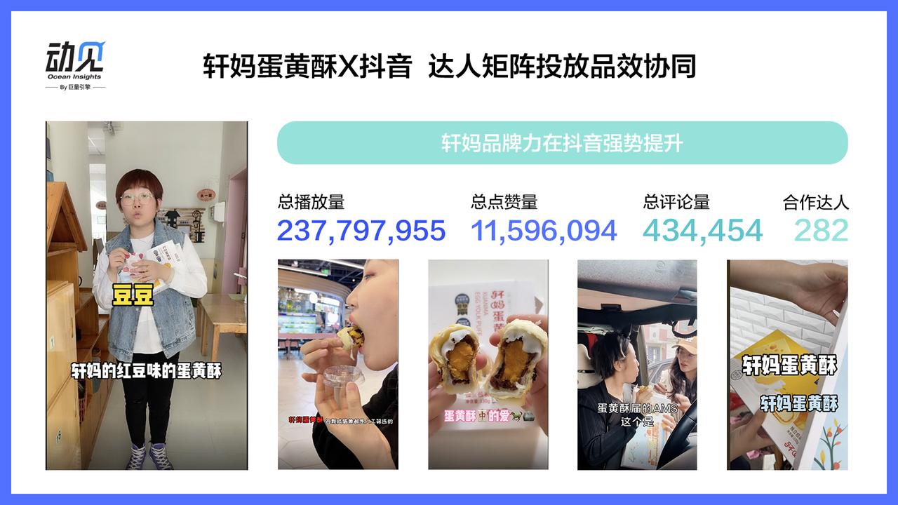 以轩妈蛋黄酥618达人合作项目为例。根据品牌主兼顾品牌传播和效果的营销目标,巨量星图帮助该品牌着重筛选了性价比更高的粉丝量在30-100w腰尾部达人,覆盖多个垂类,帮助他们进行品牌人群的广泛影响和关系资产扩充;通过一口价达人购买+投稿任务的方式,共合作了近300个达人,保证多元内容产出的同时,也打造了一批高质量的达人内容素材,通过达人素材复用+人群追投发挥了联动效应,达人合作周期内,自播场均GMV提升了150%。