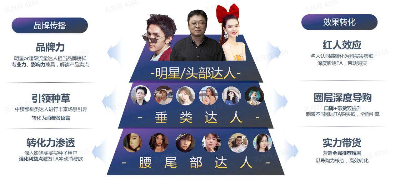 • 明星/头部达人:他们由于自身拥有较高的知名度和影响力,通常可以为品牌提供证言和背书,快速建立品牌信任;并且由于红人效应带来的认同感更容易转化为购买决策,从而带动粉丝购买。