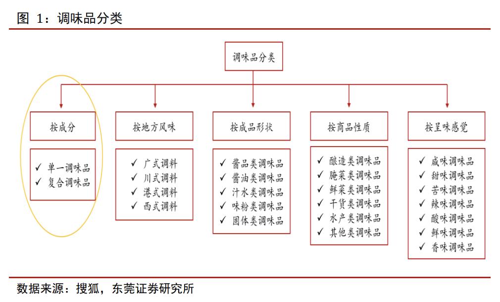 调味品细分板块众多,根据不同的分类标准可以分为不同的类别。按照成分划分的单一调味品和复合调味品,是目前最常用的分类方法。日常生活中,最考验烹饪技艺的油、盐、酱、醋就属于单一调味品。