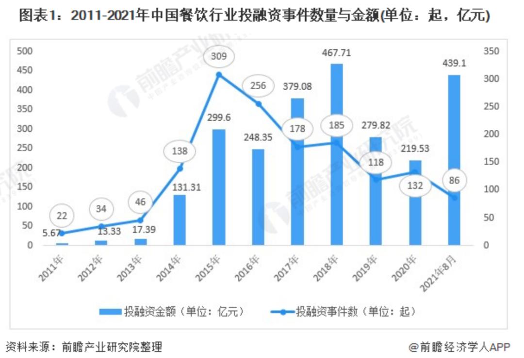 根据前瞻产业研究院发布的数据,2018年是餐饮行业的一个投资窗口,之后两年投资热度逐渐下降,后疫情时代下,资本热情爆发,截止2021年8月,中国餐饮行业投融资事件86起,涉及到的投融资金额439.1亿元,是2020年全年的2倍。