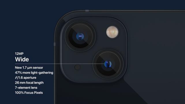 去年在iPhone 12 Pro上使用的Sensor-Shift OIS(光学图像防抖)技术下放至iPhone 13和13 mini。新摄像头的在单位时间内的进光量增加了47%,单个像素的面积可以达到1.7μm。
