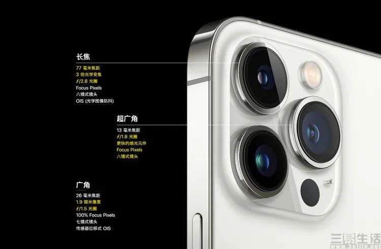 此外在影像系统的配置上,iPhone 13 Pro和iPhone 13 Pro Max同样也体现了苹果“后发先至”的设计风格。首先,苹果方面在这两款机型的广角端,都使用了一枚单像素尺寸高达1.9微米的1200万像素CMOS。推算一下便可得知,这款CMOS的尺寸应该高达1/1.7英寸,也就是说苹果用其他厂商6400万像素大底CMOS的面积,做了一枚1200万像素的高感光传感器。