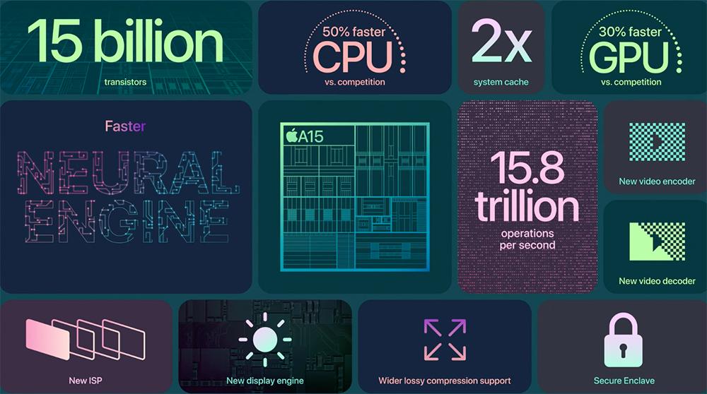整体来看,除了核心性能的提高外,A15芯片在新的显示引擎、新视频编码器和解码器,以及2倍系统缓存等方面也有着大幅度提升。