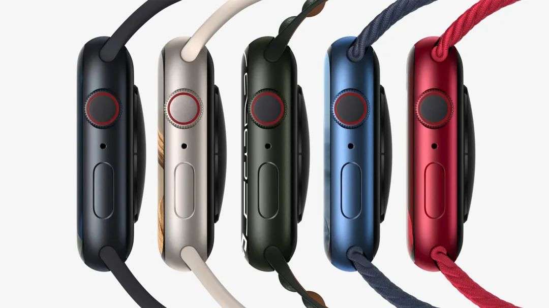 颜色方面,Apple Watch Series 7取消了过去常用的银色,取而代之的是全新的星光色与午夜色外壳(黑/蓝/红/星光色/午夜色)。材质方面,Apple Watch Series 7提供铝合金、不锈钢与钛金属三种表壳材质。