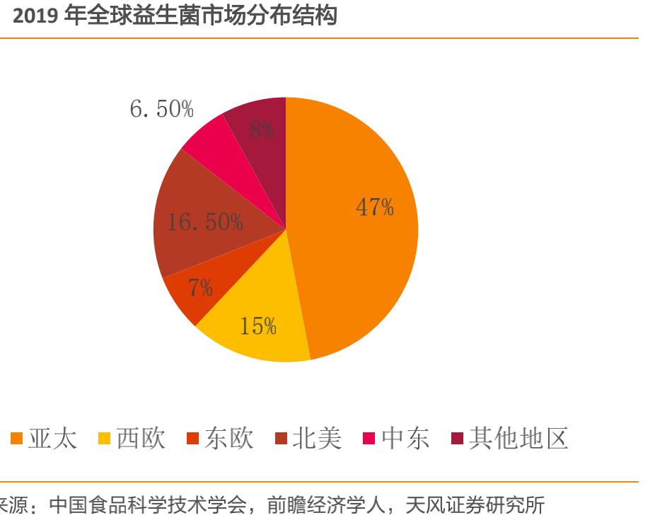 但是我国却是益生菌的消费大国。根据欧睿国际,目前世界上益生菌产业已近达2225 亿元,依然处于增长趋势。在全球益生菌行业蓬勃发展大背景下,亚太地区整体市场规模表现抢眼,中国食品科学技术学会益生菌分会数据显示,亚太地区益生菌消费规模占全球规模的份额进一步扩大,高达47%。2017年,我国是仅次于美国、意大利的第三大益生菌消费大国。