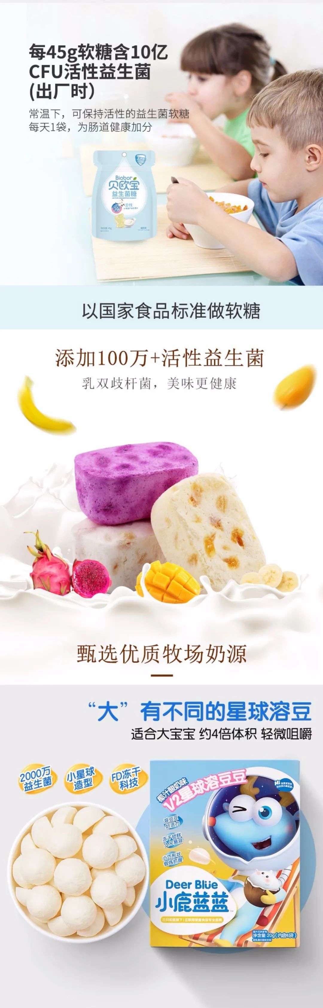 1、小鹿蓝蓝:益生菌酸奶溶豆,强调2000益生菌添加;