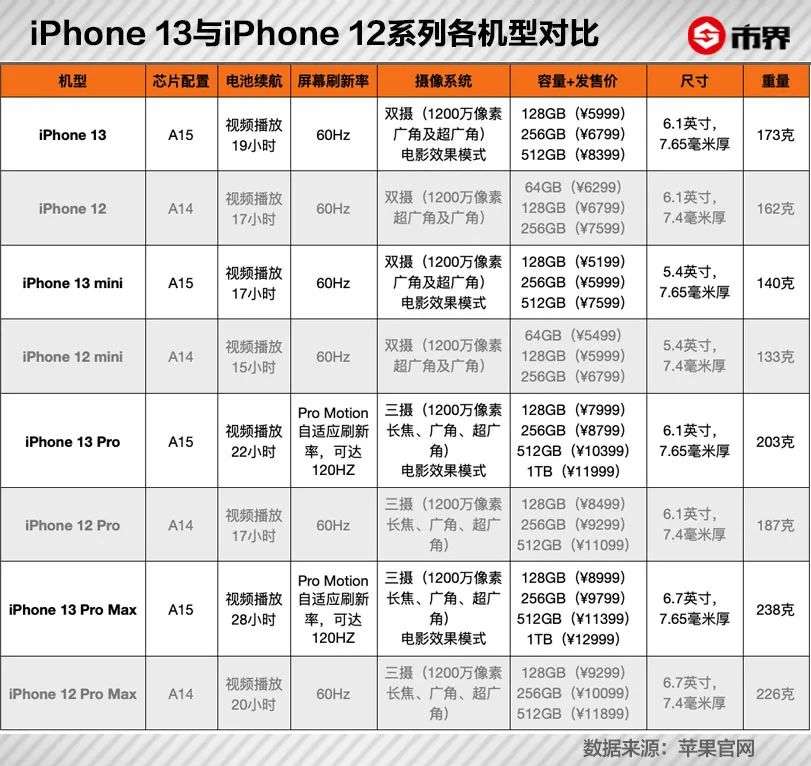 iPhone 13系列的四款机型最大的亮点就是价格。手机本身除了应用最新的A15芯片、一系列新摄像功能升级,以及Pro和Pro Max版本支持1TB的超大存储选项,提供120Hz高屏幕刷新率外都算是对于iPhone12的修修补补。