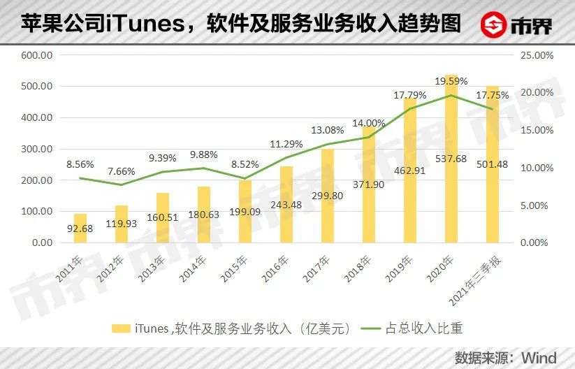 从财报数据来看,2012年以来,iTunes、软件及服务业务为苹果带来的业务收入从120亿美元增至2020年的538亿美元,占总收入比重从7.66%提高到19.59%。