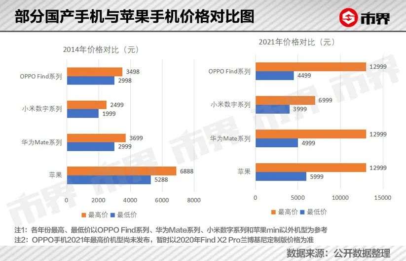 整理数据发现,2014年国内华为、小米、OPPO的高端系列机型,起售价在1999至2999元,高配置版本也不过3699元,都不超过苹果的6成。