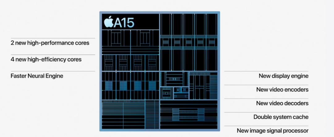 iPhone13系列也搭载了A15仿生芯片,全新的6核中央处理器,搭载了2个性能核心和4个能效核心,内部集成了150亿颗晶体管,同时神经网络引擎最高可达每秒15.8万亿次运算。