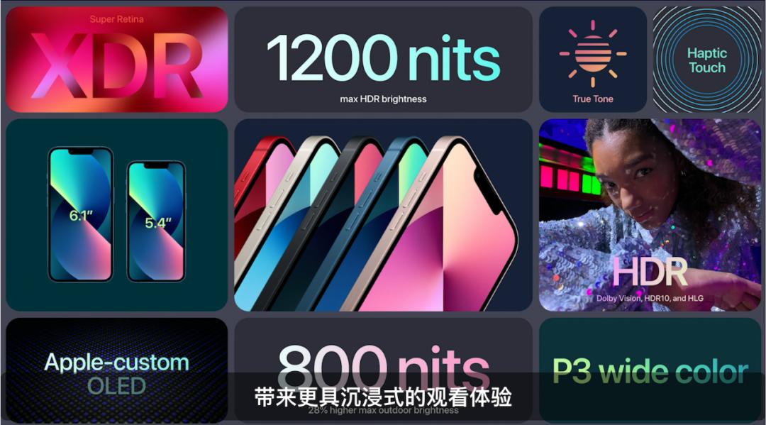 iPhone13系列均采用了超视网膜XDR显示屏,因此亮度提升了28%,最高可达800尼特,HDR内容的亮度峰值也达到了1200尼特。