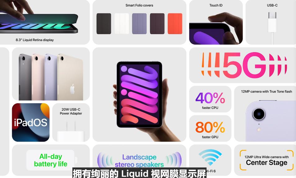 另一款产品iPad mini 6则迎来大幅升级。外观更加接近iPad Air/Pro,变得棱角分明;舍弃了Home键,改用更现代的全面屏设计,屏幕尺寸从8英寸升至8.3英寸;CPU为A15仿生芯片,与iPhone 13齐平。