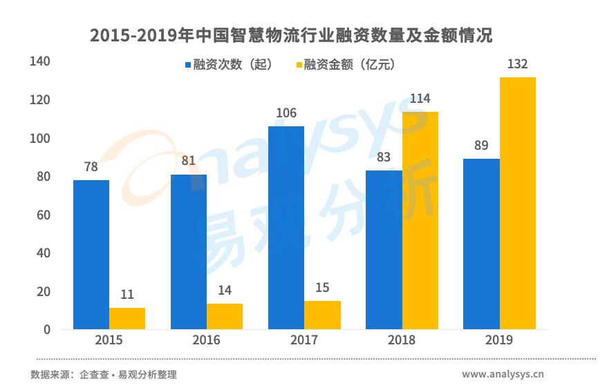 从融资次数和融资金额可以看出,虽然2019年融资次数相较于2017年大幅下降,但融资金额逐年递增,2019年融资金额达132亿元,同比增长15.8%,投资企业加大对智慧物流的投资力度,助力智慧物流的快速发展。