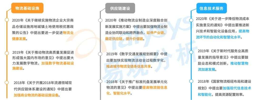 在“工业4.0”、“互联网+”发展的大背景下,中国物流行业也迎来了智慧化升级改造,近年来,国家发布了多项政策以促进“智慧物流”的快速发展。总体看来,政策主要从物流基础设施设备、供应链建设水平、服务模式和信息技术应用等多方面引导和促进中国“智慧物流”的发展。