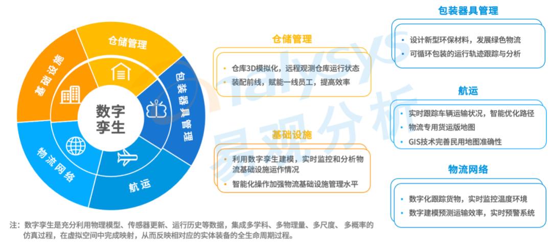 在大数据的支撑下,数字孪生在仓储管理、包装器具管理等五大物流分支建立了密切联系,能对实体产品和服务作全生命周期的追踪。同时通过该技术能够提升物流效率、降低物流成 本、基于数据进行智慧化管理和决策,进一步促进物流和供应链管理水平的快速发展。
