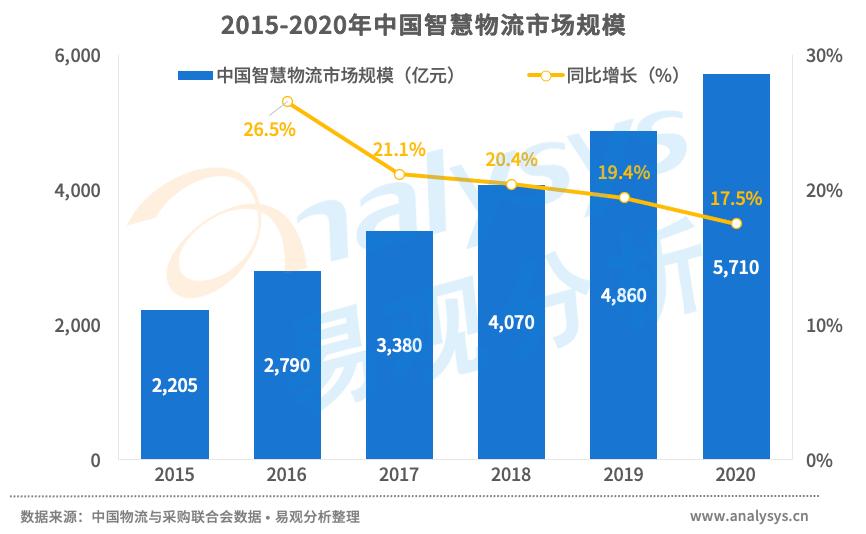 根据中国物流与采购联合会数据,当前物流企业对智慧物流的需求主要包括物流数据、物流云、物流设备三大领域,2016-2019年我国智慧物流市场规模增速均保持在两位数以上,2020年市场规模已经达到5710亿元,同比增长17.5%。近年来,随着物联网、人工智能等技术的发展,以及新零售、智能制造等领域对物流的更高要求,智慧物流市场规模将持续扩大。