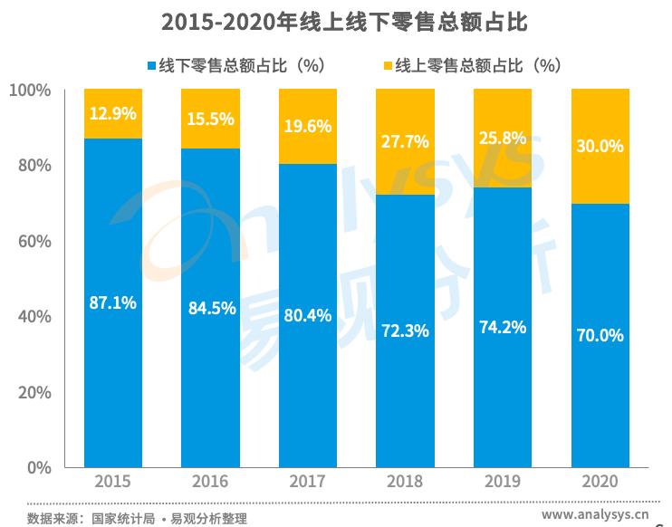 在疫情影响的背景下,2020年中国线上零售市场规模达11.8万亿元,同比增长10.9%,用户规模达7.8亿人,同比增长9.9%,线上零售市场规模和用户规模稳步增长。同时2020年线上零售渗透率达30%,同比增长4.2个百分点。