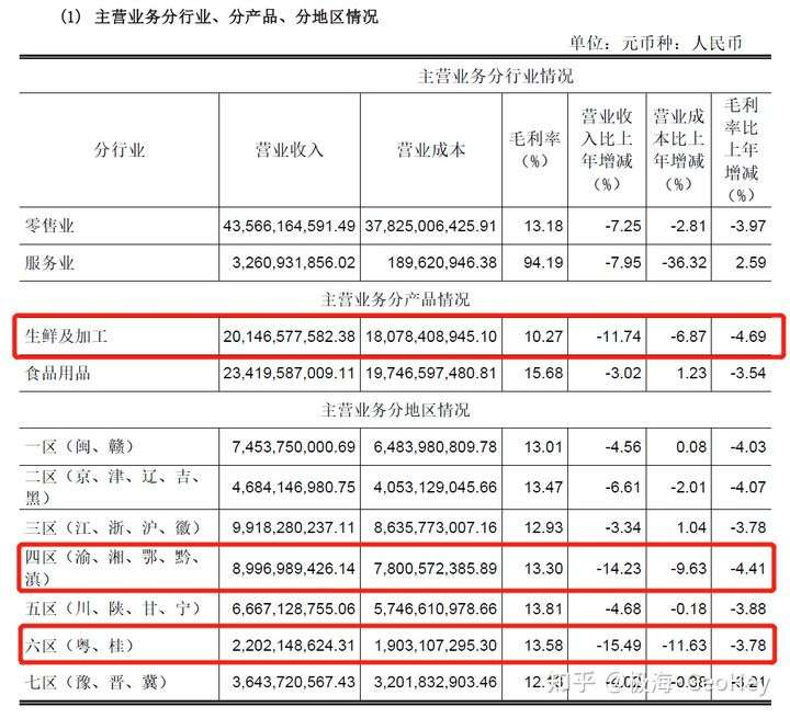 在永辉超市的主营业务中,生鲜及加工营收降幅最大,同比下降11.7%,而其中又以四区(渝湘鄂黔滇)14%、六区(粤桂)15.49%的降幅最大,二者分别是兴盛优选和钱大妈的强势区域。