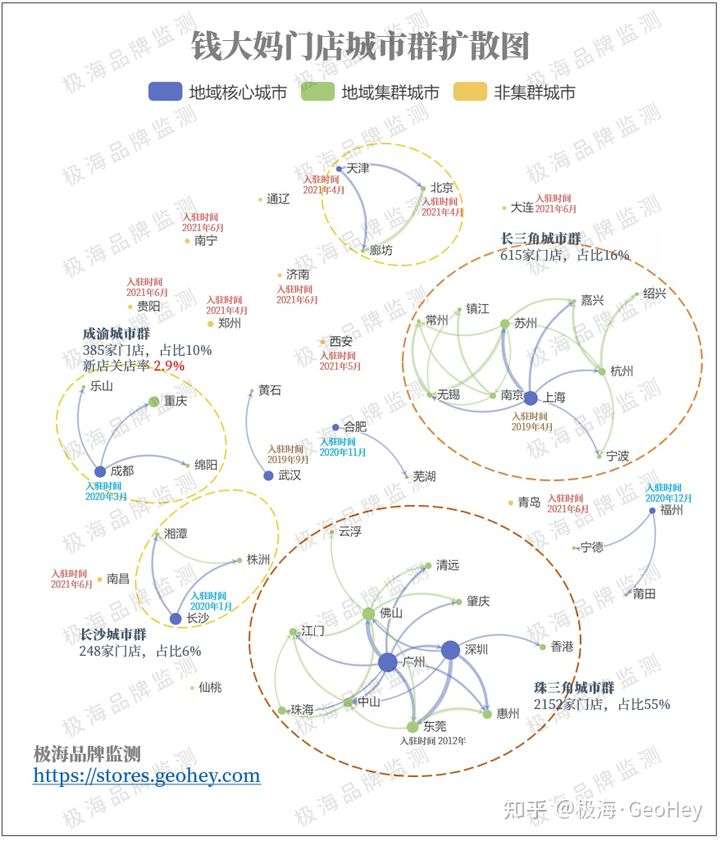 ▲ 以2021年8月底现存门店作为制图依据。城市群的划分以城市间的人口流动强度界定。箭头方向代表扩散方向,线条粗细代表两个城市之间的人口流动强度。数据来源:极海。