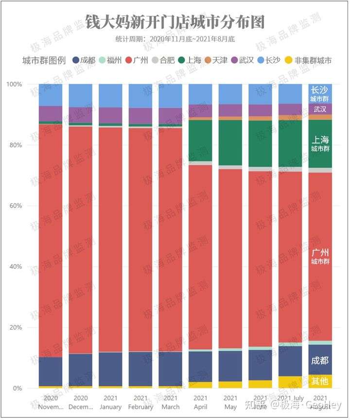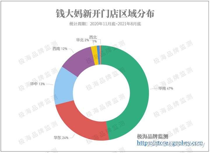 ▲ 在2020年10月底~2021年8月底之间,在钱大妈新开业的1573家门店之中,不同地域门店的占比。数据来源:极海(https://stores.geohey.com)