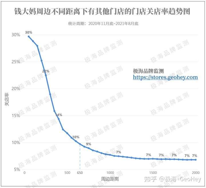 ▲ “周边距离”代表我们统计的口径,如“300”意味着我们以一家门店为圆心,判断其300米范围内是否有其他门店,如果有则计入统计范围,没有则不计入。然后再统计在这些判断为“有”的门店中,哪些是已经关闭的门店,最后用得到的关店数量除以纳入统计中的门店数量,得到在该距离下的关店率。上图以2020年10月底~2021年8月底之间的关店数据作为统计口径,其他门店包含了历史所有未关闭门店,未做具体区分,所以平均关店率为6.6%,而非新开门店的平均关店率10.5%。数据来源:极海(https://stores.geohey.com)
