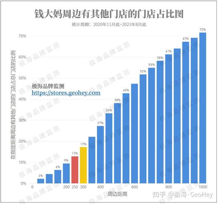 ▲ “周边距离”代表我们统计的口径,如“300”意味着我们以一家门店为圆心,判断其300米范围内是否有其他门店,如果有则计入统计范围,没有则不计入。最终用判断为“有”的门店数量除以门店总数,得到该类门店在所有门店中的占比。上图为2020年10月底~2021年8月底之间存续过的门店,包括已经关闭的门店。数据来源:极海(https://stores.geohey.com)