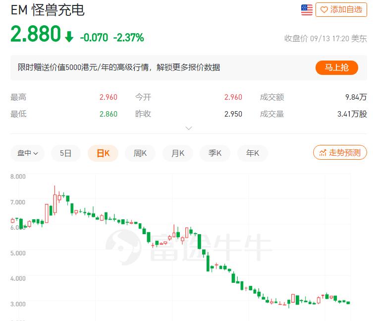 怪兽充电有阿里加持、市场份额已居行业第一,这又如何?上市以来,公司股价持续走低,截至目前,2.88美元的股价,较发行价跌去近7成。