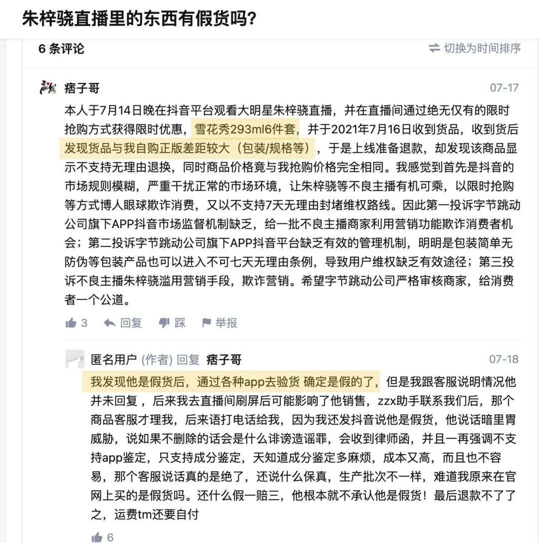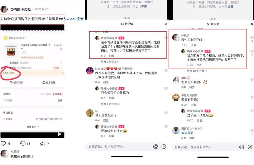 然而,网上质疑朱梓骁卖假货的网友却越来越多。有网友表示在直播间里买到了假的雅诗兰黛眼霜,也有的表示在他直播间里购买的雪花秀6件套与自购正版在包装和规格方面都有差距;甚至有人称自己做了两次鉴定都为假货,但朱梓骁方面始终置家人和老铁不顾,没有任何回应。