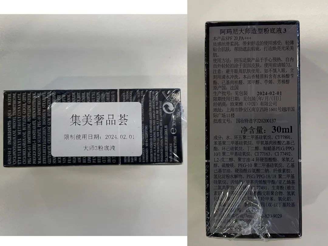 这瓶阿玛尼大师粉底液的外包装盒最外层被透明塑封膜包裹,在塑封膜里面,有一张写着“集美奢品荟”的白色标签贴在包装盒上。很明显,这是在盒子上贴好白色标签后再进行二次塑封的。