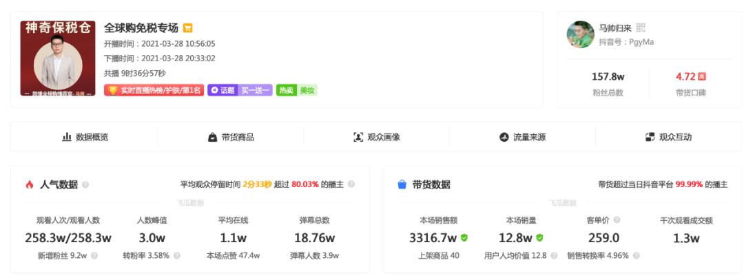 今年的3月28日,电商主播“马帅归来”,在抖音开启一场名为“全球购免税专场”的直播。据飞瓜数据专业版显示,当天直播销售额为3316.7万元。