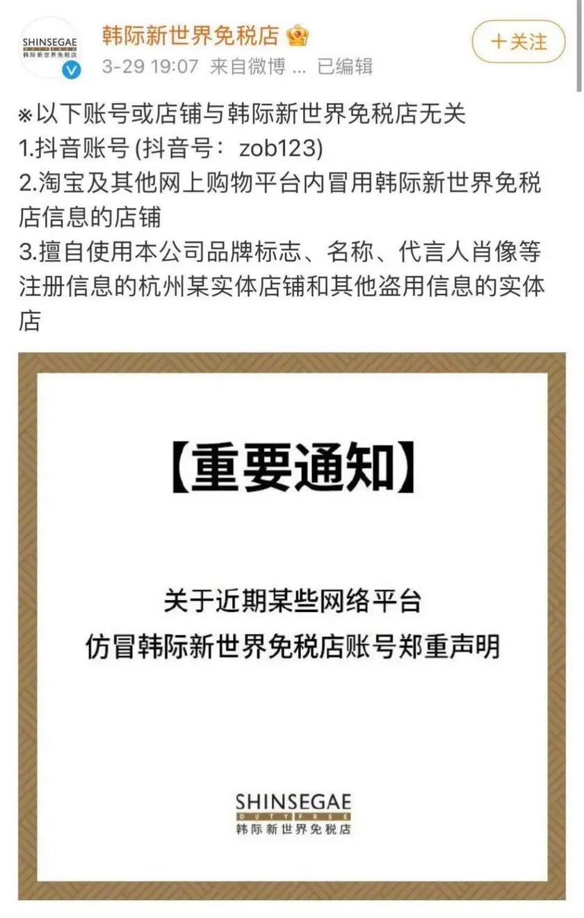 然而,就在这场直播的第二天,“韩际新世界”的官方微博账号发布声明,称马帅3月28日直播中的供货商家与品牌方无关。