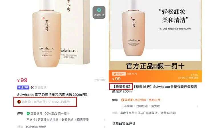 在8月31日这场直播中,新腕儿发现,同样一款雪花秀洗面奶,朱梓骁直播间里同时挂了两个链接,分别指向两家抖音小店。