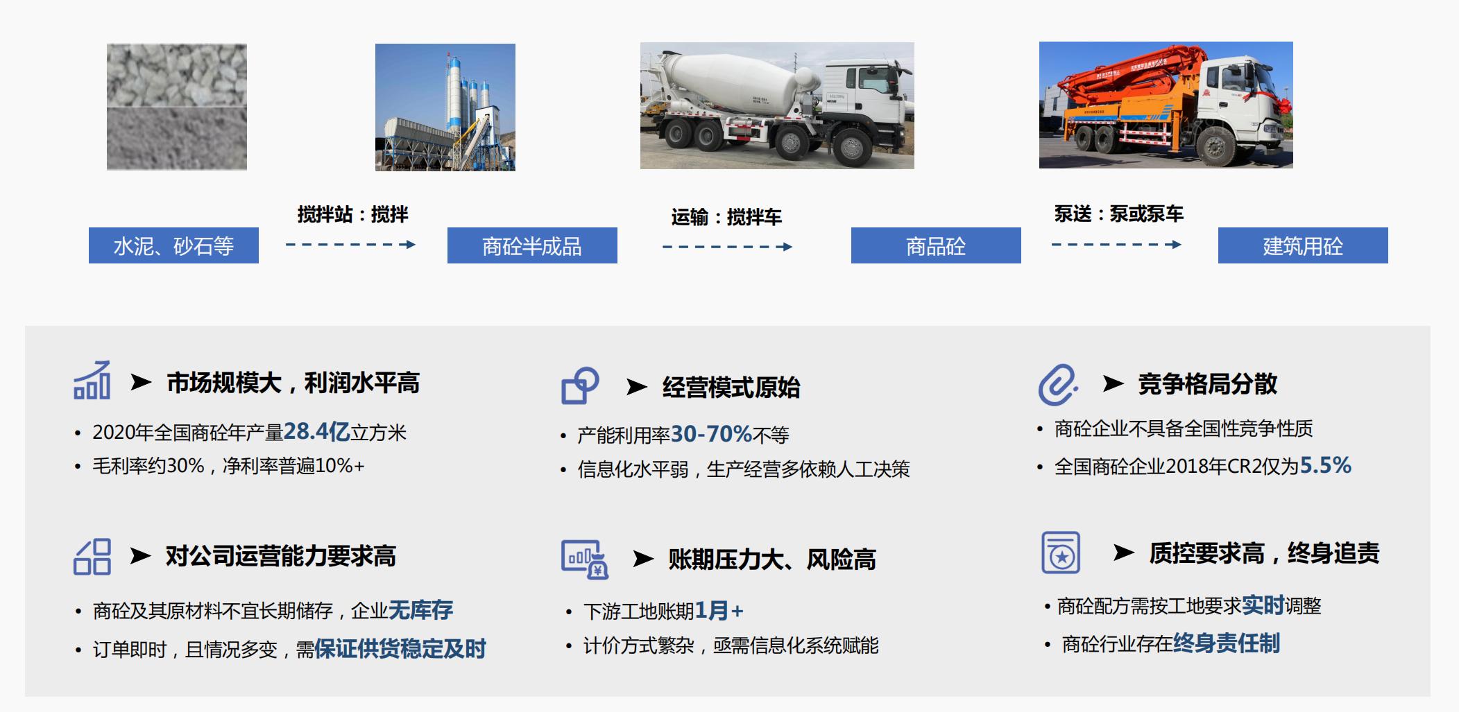 据了解,当前商砼行业市场规模庞大,年产值达1.5万亿元,毛利率高约30%。然而行业普遍存在着两大痛点,一是大多企业经营手段原始,主要依靠人的经验进行决策,各环节粗放;二是商砼作为一种流体材料,生命周期短,对公司运营能力要求高,同时只能在一定服务半径内经营,难以形成全国性规模化的行业生态。